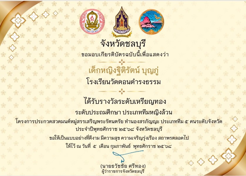ได้รับรางวัลเหรียญทอง ระดับประถมศึกษา ประเภททีมหญิงล้วน โครงการประกวดสวดมนต์หมู่สรรเสริญพระรัตนตรัย ทำนองสรภัญญะประเภททีม 5 คนระดับจังหวัด