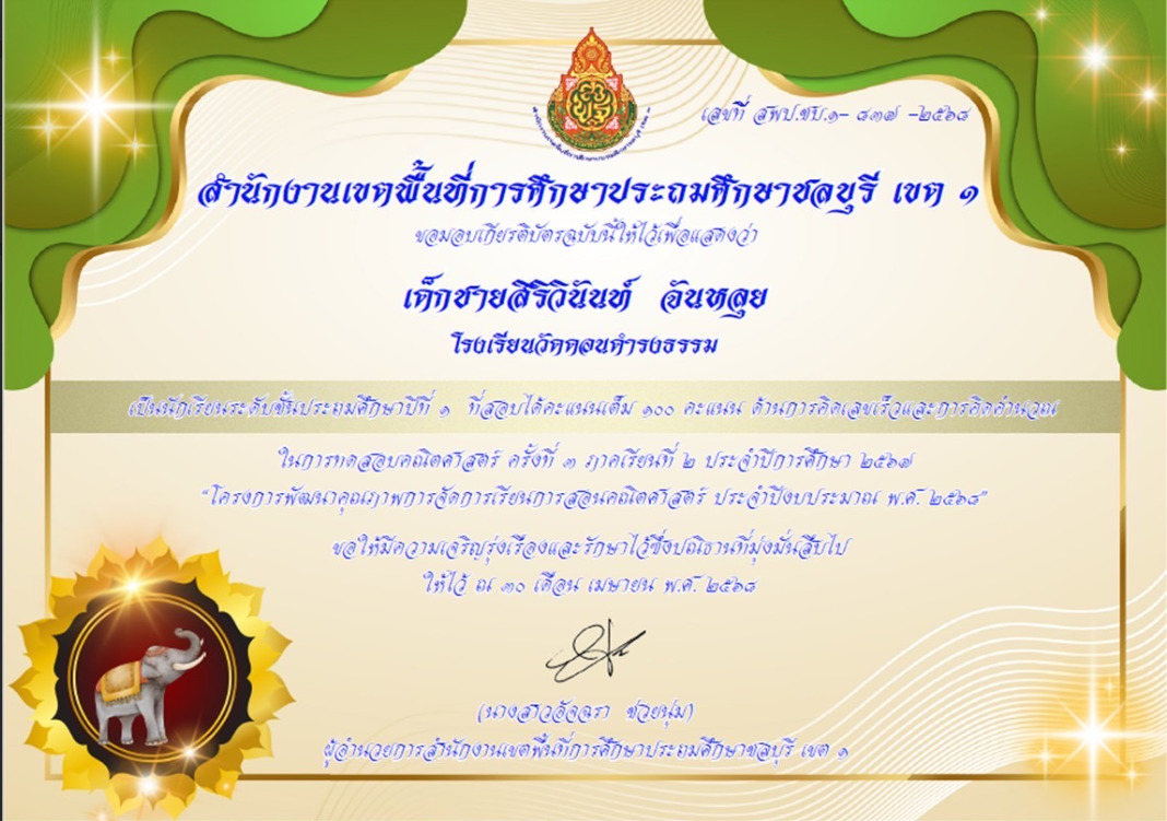 เป็็นนักเรียนระดับชั้นประถมศึกษาปีที่ 1ที่มีผู้เรียนได้คะแนนสอบเต็ม 100 คะแนน ด้านการคิดเลขเร็วและการคิดคำนวณ จำนวน 1 คน