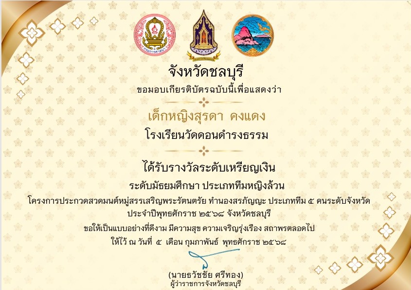 ได้รับรางวัลเหรียญเงิน ระดับมัธยมศึกษา ประเภททีมหญิงล้วน โครงการประกวดสวดมนต์หมู่สรรเสริญพระรัตนตรัย ทำนองสรภัญญะประเภททีม 5 คนระดับจังหวัด