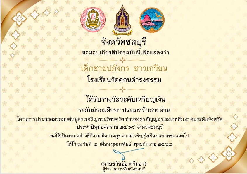ได้รับรางวัลเหรียญเงิน ระดับมัธยมศึกษา ประเภททีมชายล้วน โครงการประกวดสวดมนต์หมู่สรรเสริญพระรัตนตรัย ทำนองสรภัญญะประเภททีม 5 คนระดับจังหวัด