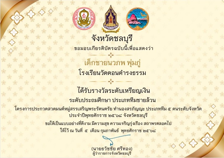 ได้รับรางวัลเหรียญเงิน ระดับประถมศึกษา ประเภททีมชายล้วน โครงการประกวดสวดมนต์หมู่สรรเสริญพระรัตนตรัย ทำนองสรภัญญะประเภททีม 5 คนระดับจังหวัด