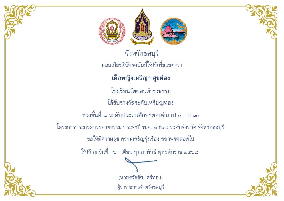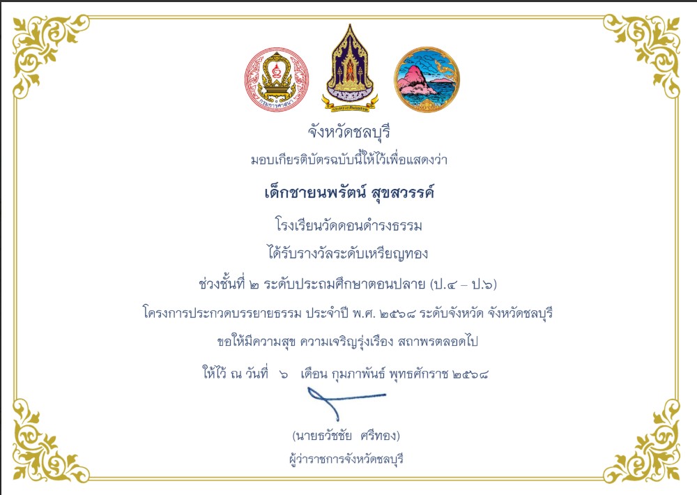 ได้รับรางวัลระดับเหรียญทอง ช่วงชั้นที่ 2 ระดับประถมศึกษาตอนปลาย (ป.4 – ป.6) โครงการประกวดบรรยายธรรม ประจำปี พ.ศ. 2568 ระดับจังหวัด จังหวัดชลบุรี