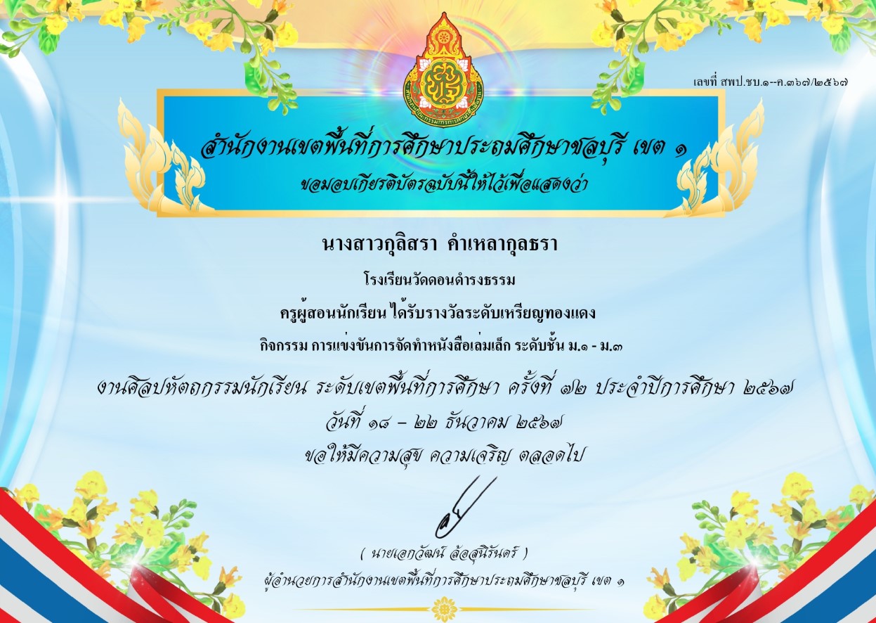 ครูผู้ฝึกสอนนักเรียน ได้รับรางวัลระดับเหรียญเงิน กิจกรรม การแข่งขันการจัดทำหนังสือเล่มเล็ก ระดับชั้น ป.4 - ป.6 งานศิลปหัตถกรรมนักเรียน ครั้งที่ 72 ประจำปีการศึก 2567 |