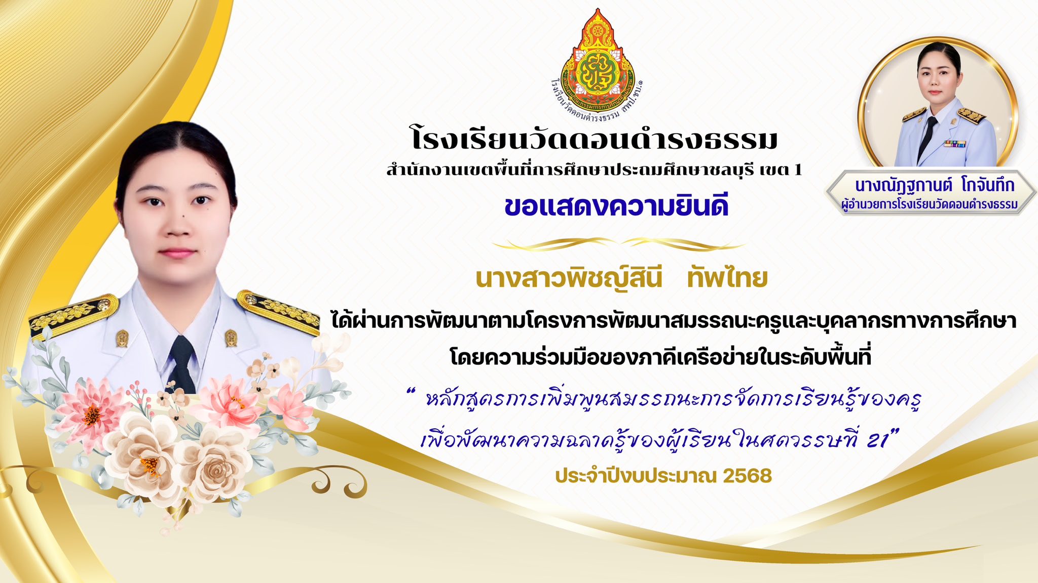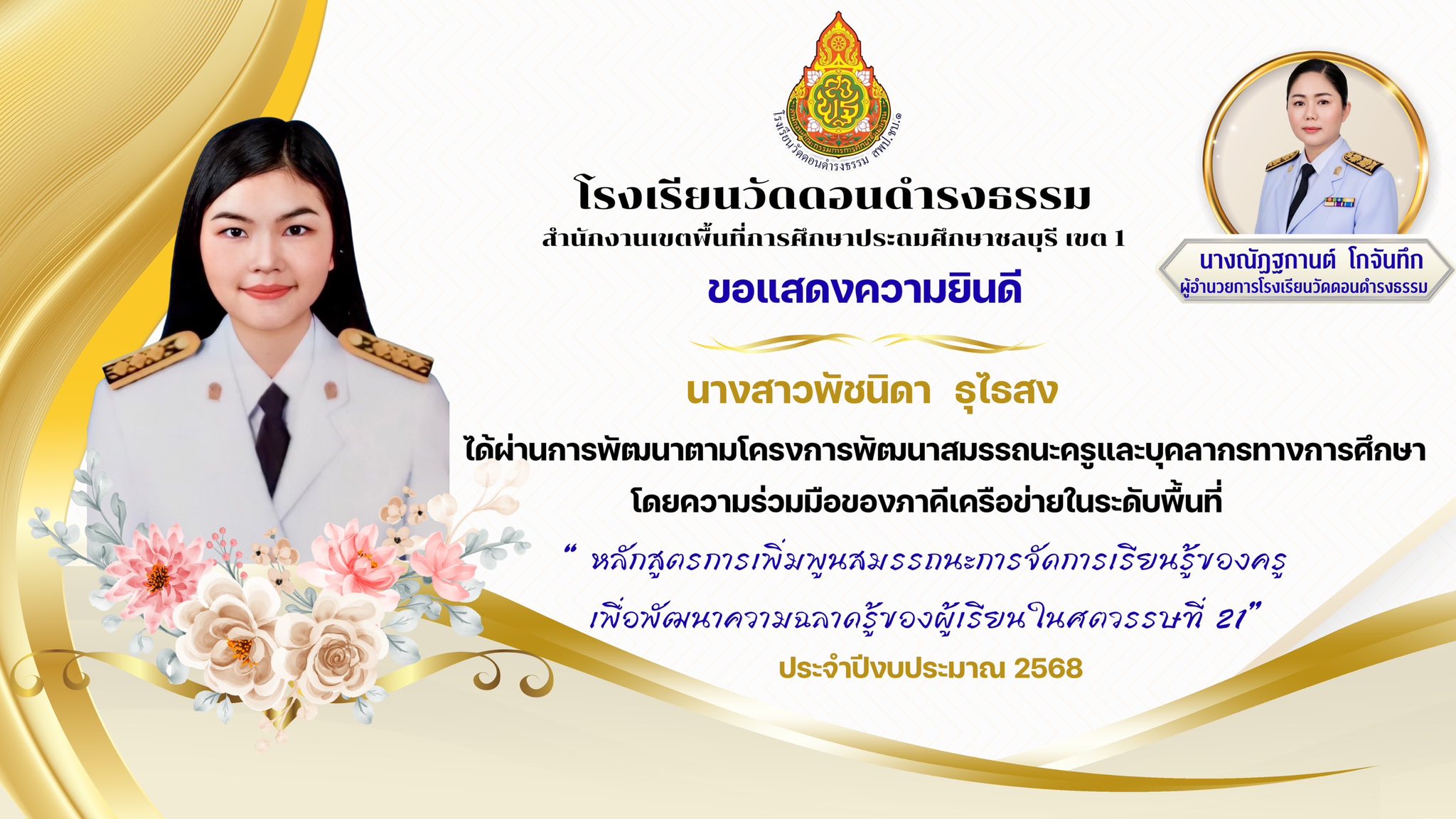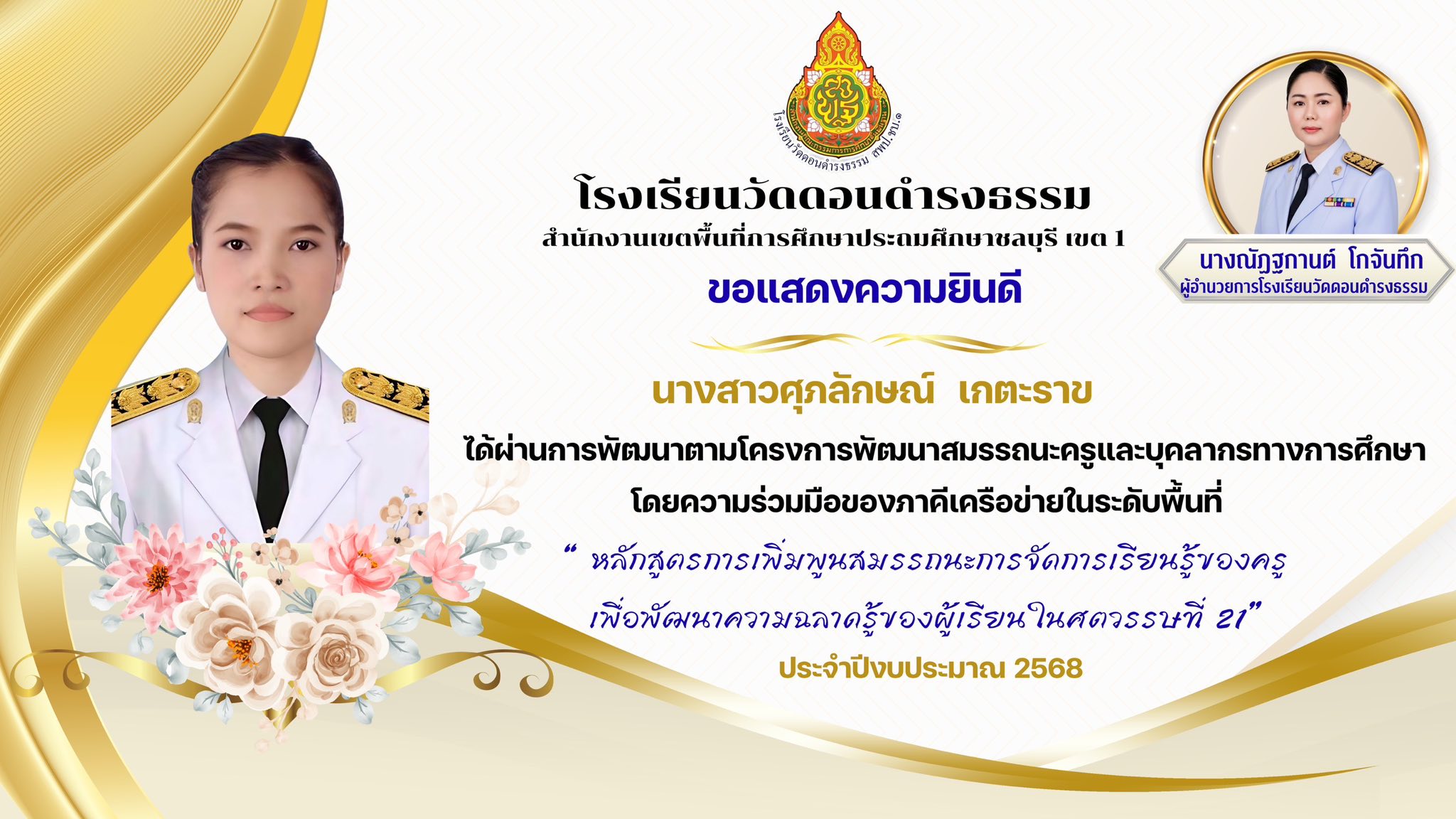 ผ่านการพัฒนา ตามโครงการพัฒนาสมรรถนะครูและบุคลากรทางการศึกษา โดยความร่วมมือของภาคีเครือข่ายในระดับเขตพื้นที่ “ หลักสูตรการเพิ่มพูนสมรรถนะการจัดการเรียนรู้ของครูเพื่อพัฒนาความฉลาดรู้ของผู้เรียนในศตวรรษที่ 21“ ประจำปีงบประมาณ 2568 |