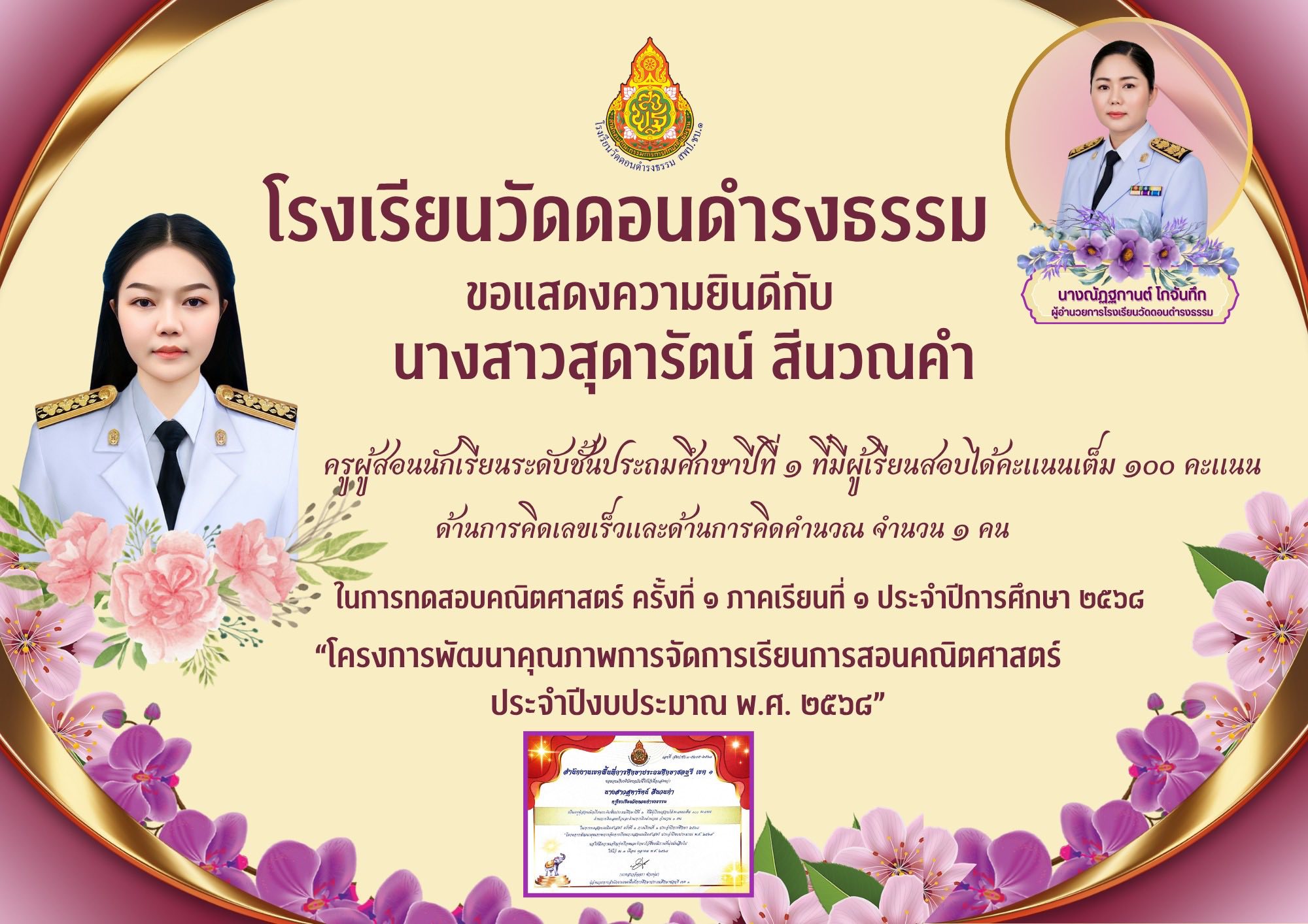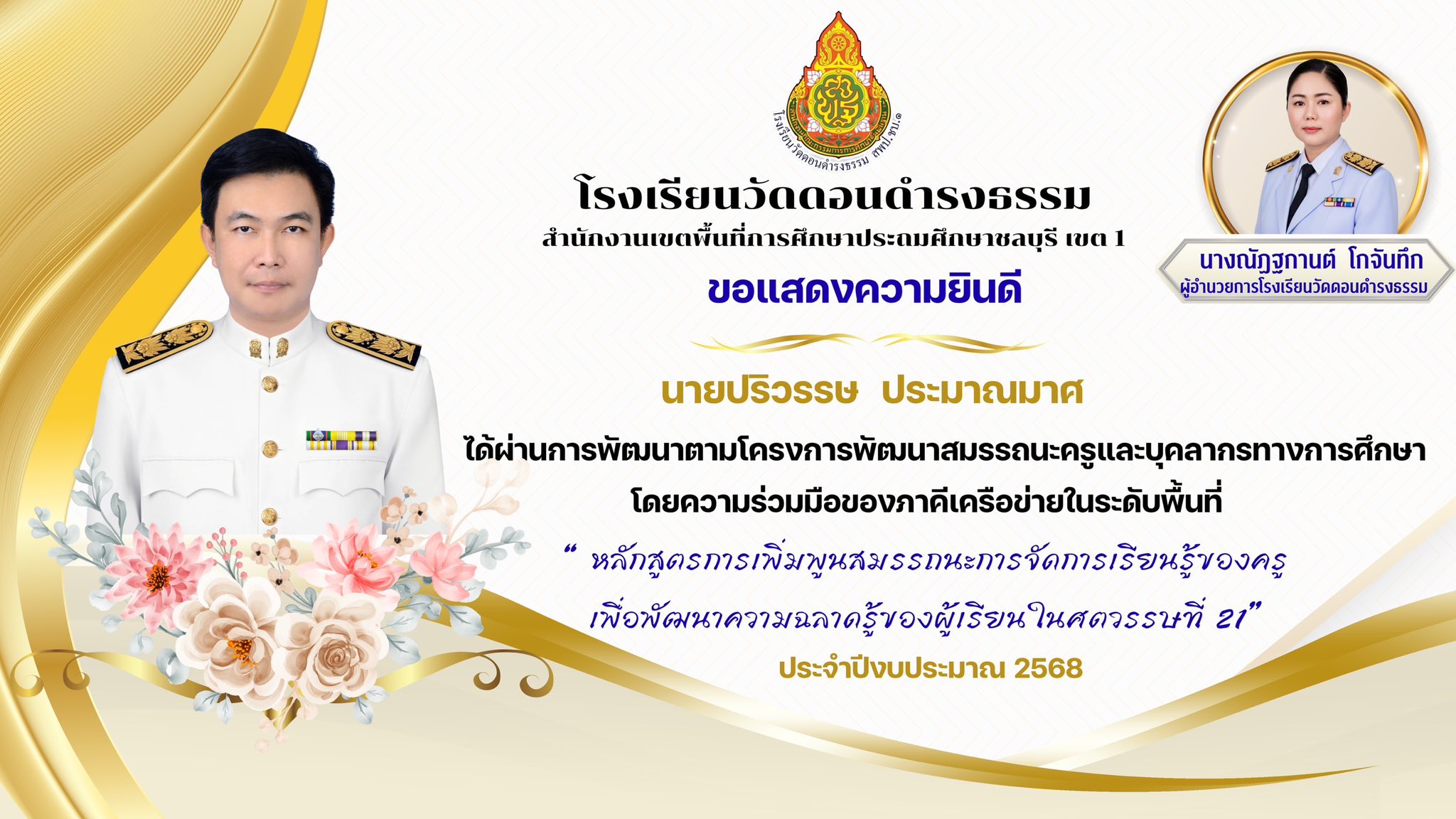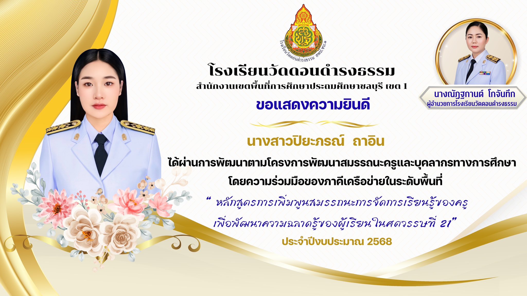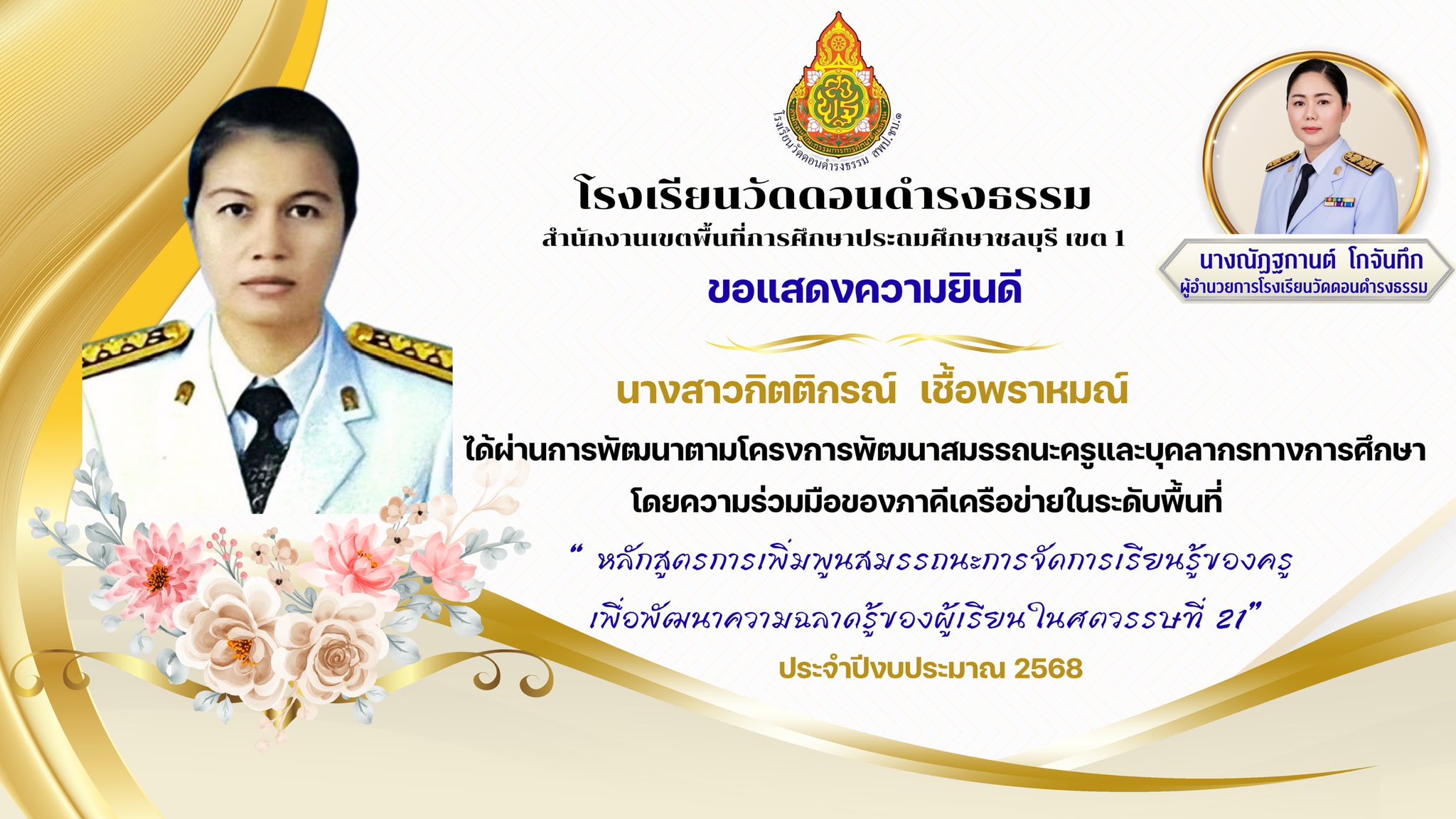 ผ่านการพัฒนา ตามโครงการพัฒนาสมรรถนะครูและบุคลากรทางการศึกษา โดยความร่วมมือของภาคีเครือข่ายในระดับเขตพื้นที่ “ หลักสูตรการเพิ่มพูนสมรรถนะการจัดการเรียนรู้ของครูเพื่อพัฒนาความฉลาดรู้ของผู้เรียนในศตวรรษที่ 21“ ประจำปีงบประมาณ 2568 |