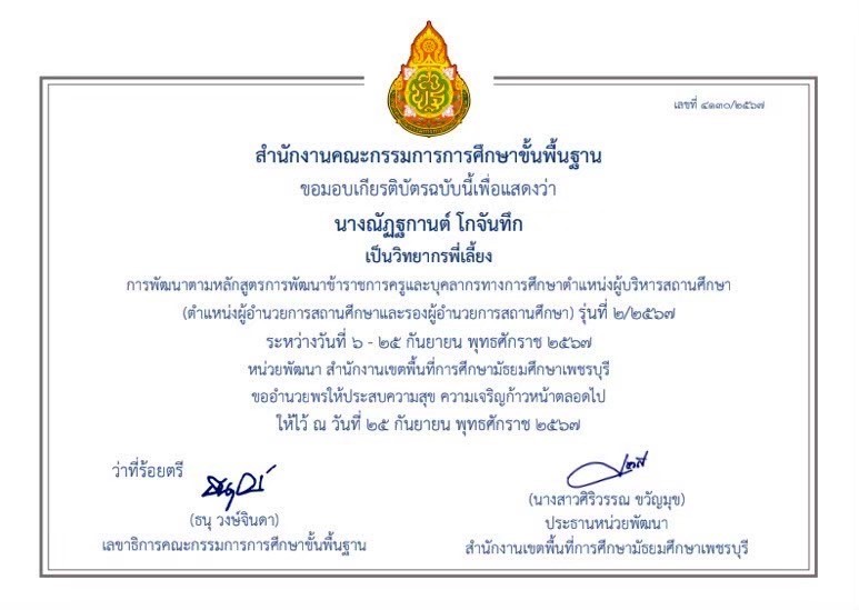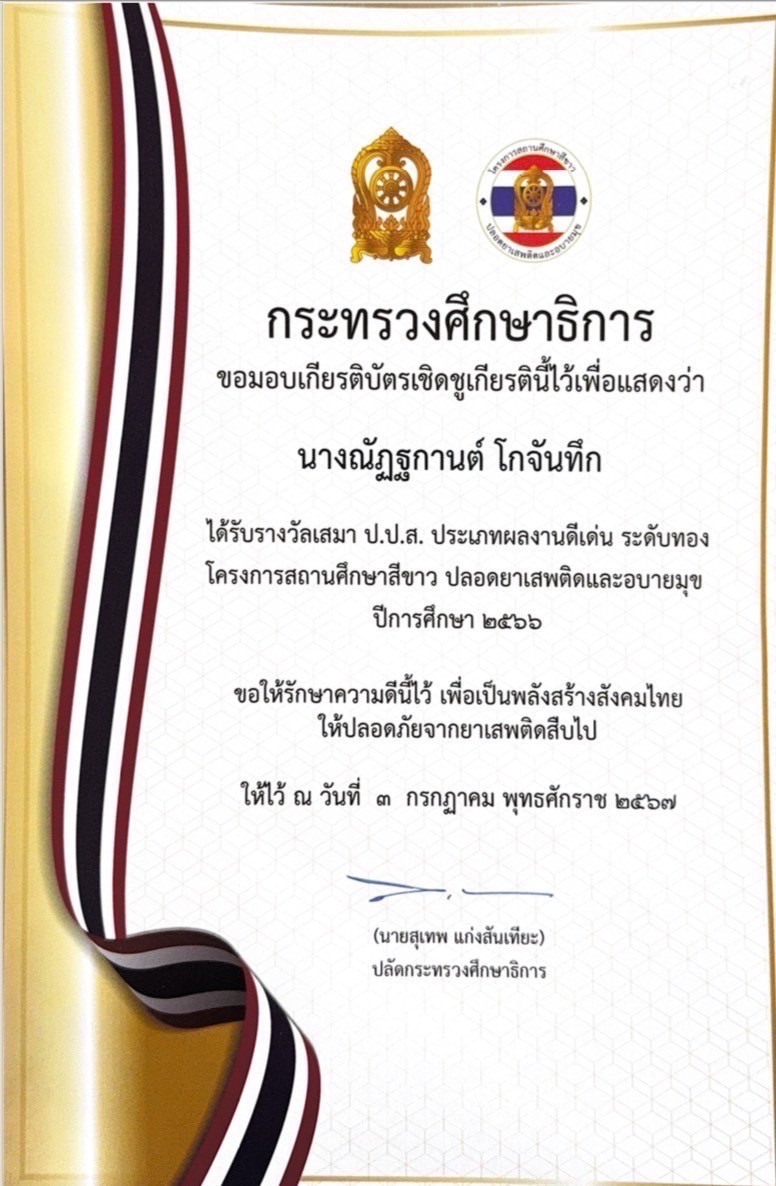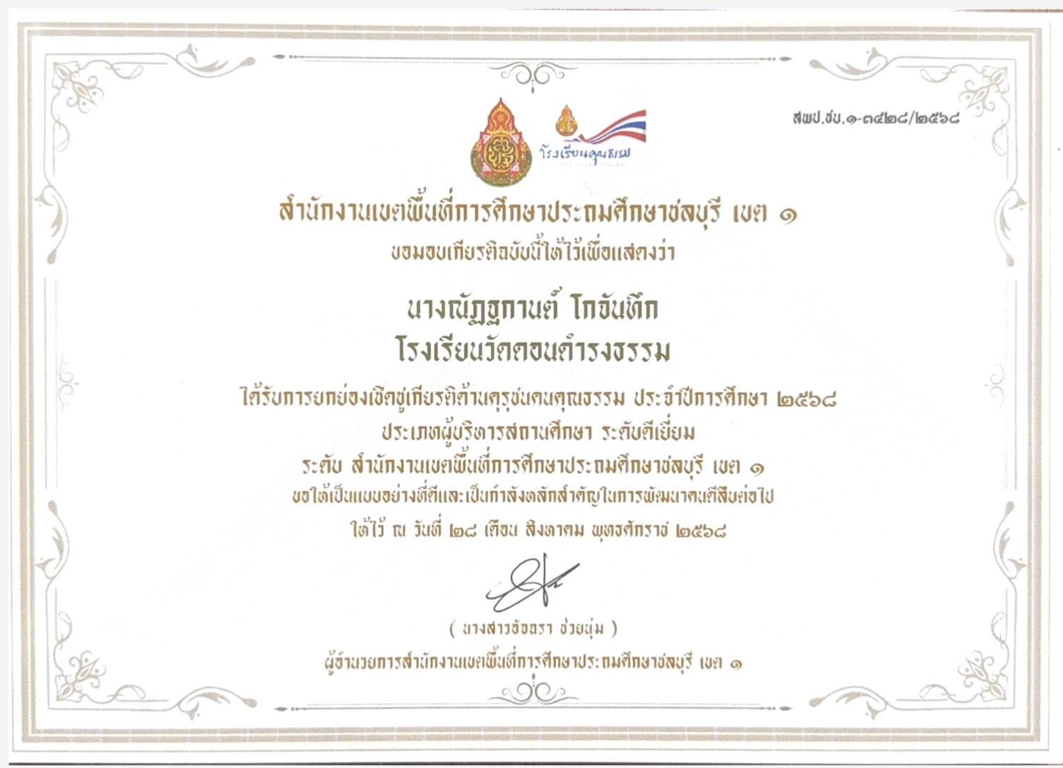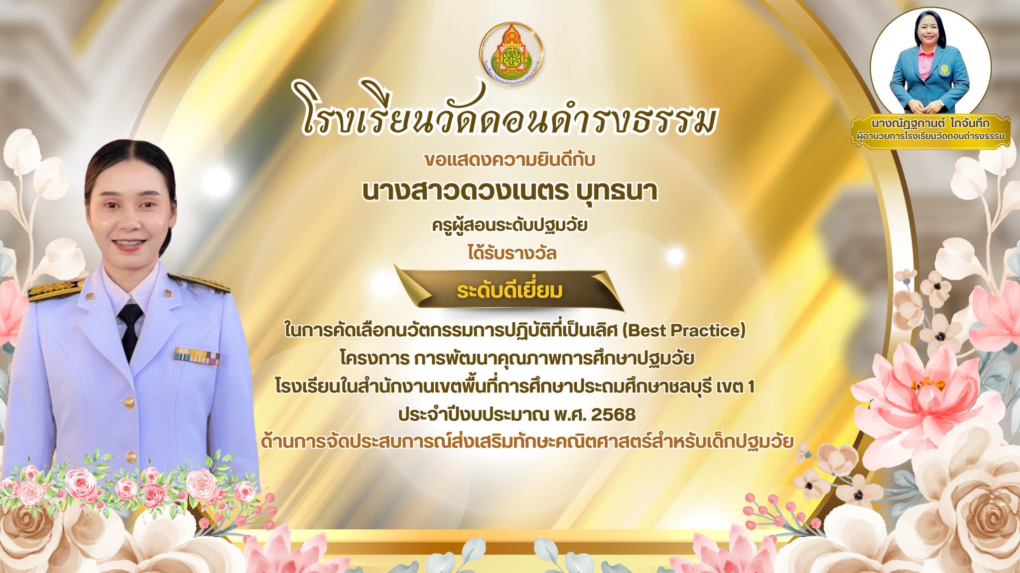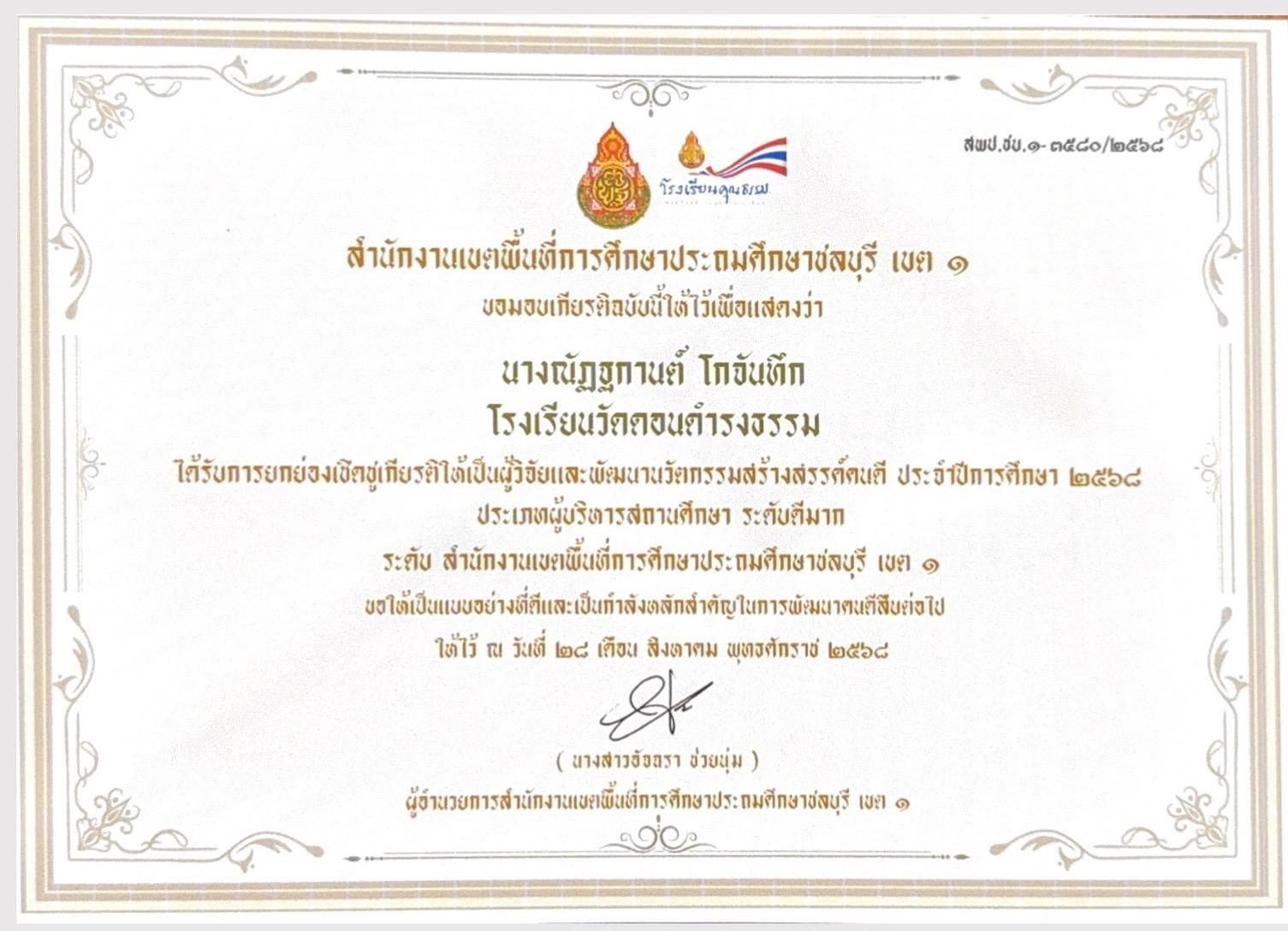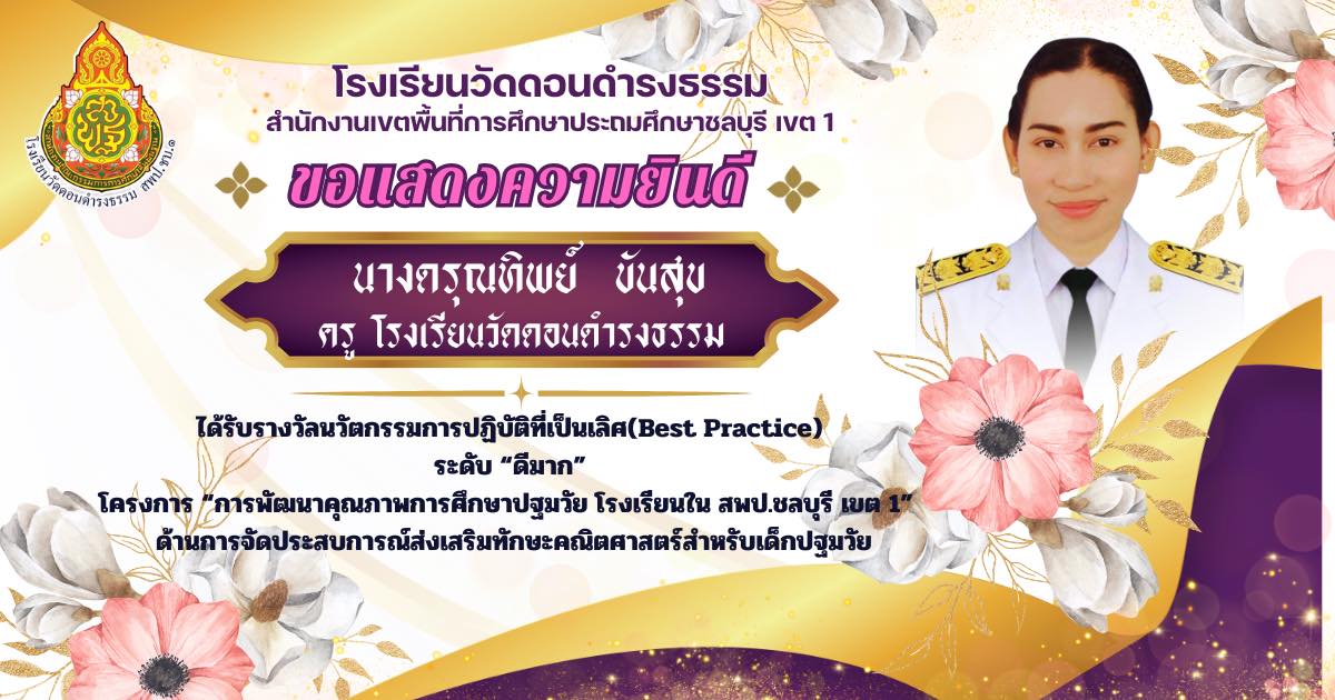 ได้รับรางวัลนวัตกรรมการปฏิบัติที่เป็นเลิศ Best Practice ระดับ“ดีเยี่ยม” โครงการ“พัฒนาคุณภาพการจัดการศึกษาปฐมวัย โรงเรียนในชลบุรี เขต 1” ด้านการจัดประสบการณ์ส่งเสริมทักษะคณิตศาสตร์สำหรับเด็กปฐมวัย |