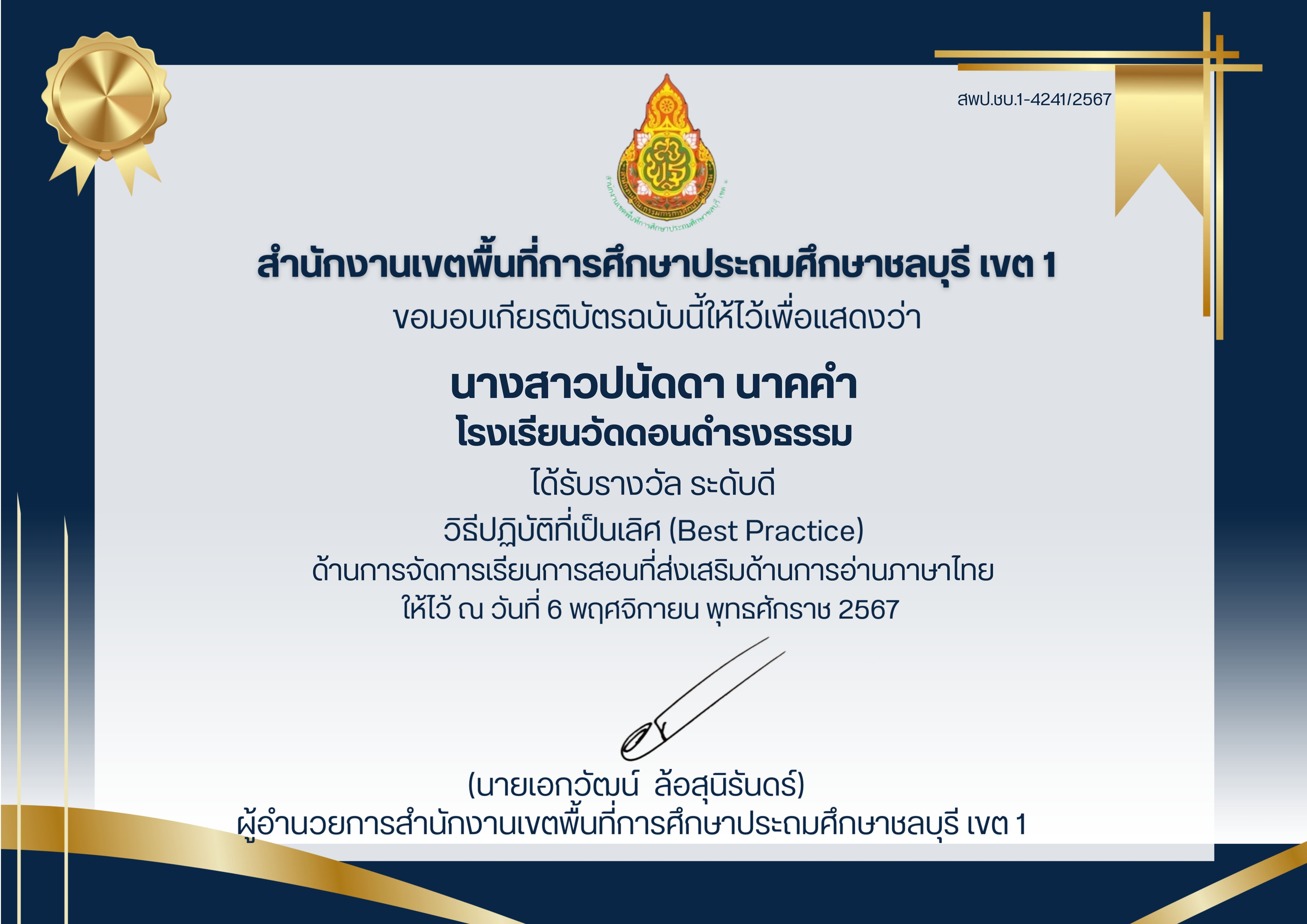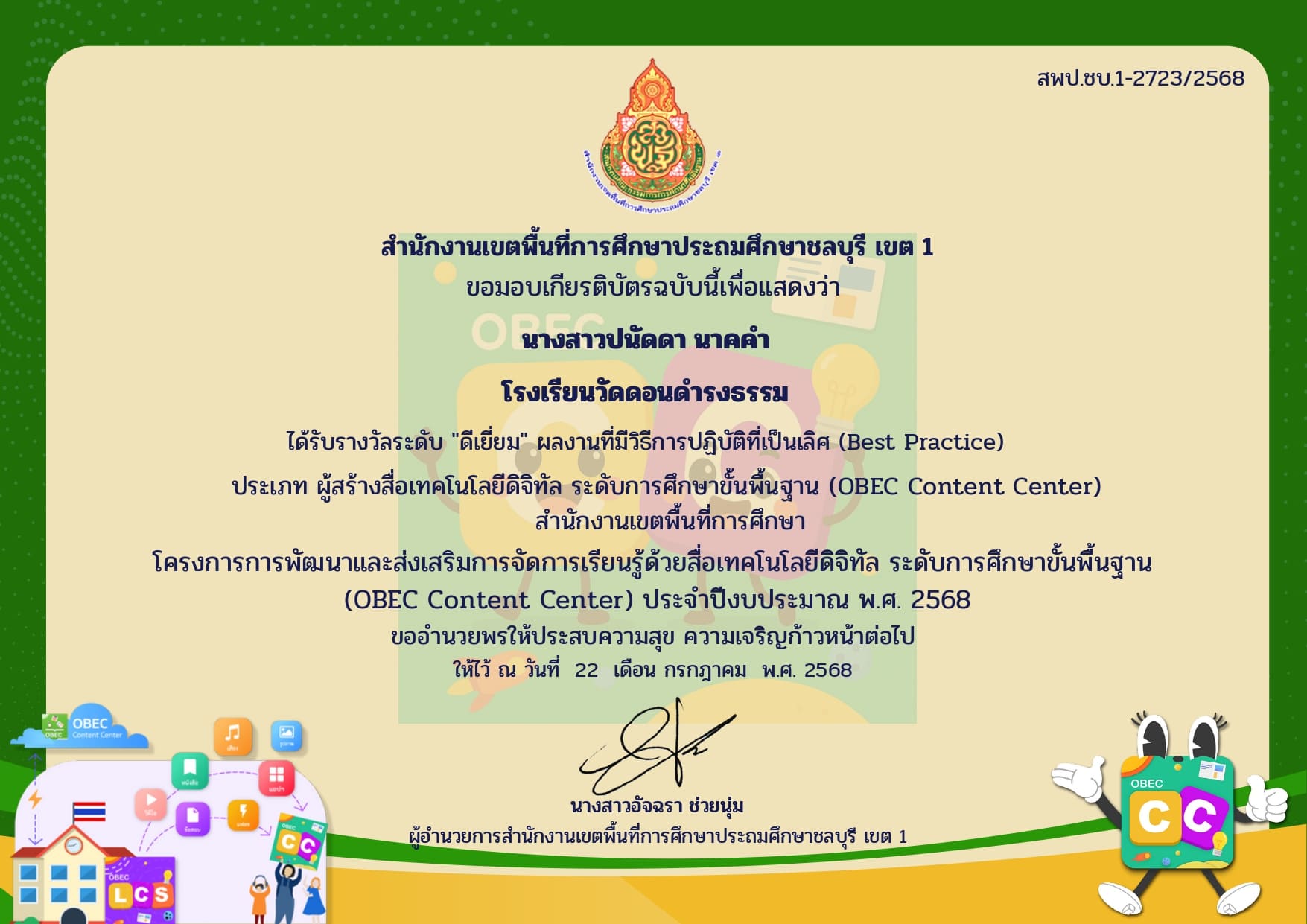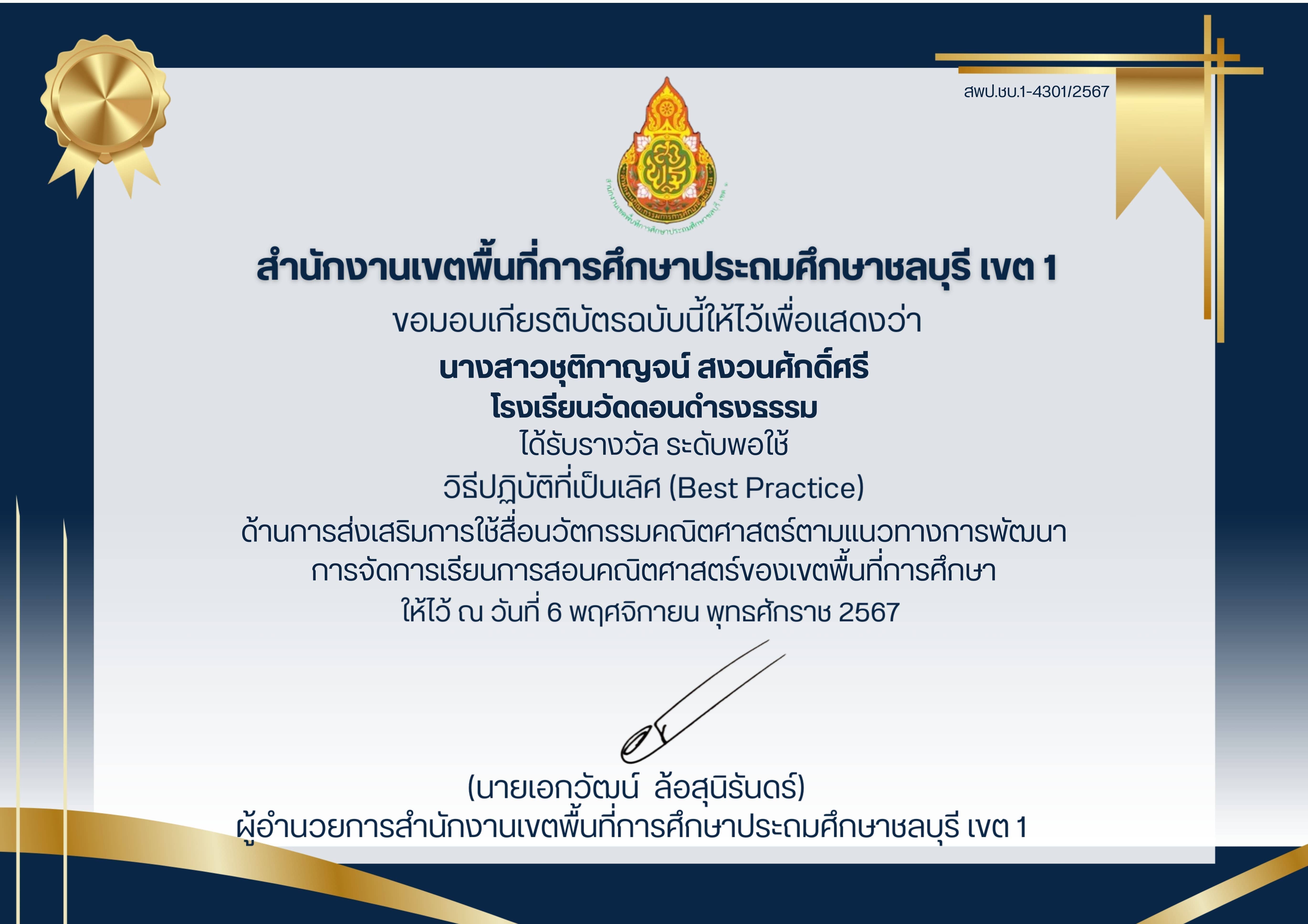 ได้รับรางวัลระดับ"ดีเยี่ยม" ผลงานที่มีวิธีการปฎิบัติที่เป็นเลิศ(Best Practice) ประเภทผู้สร้างสื่อเทคโนโลยีดิจิทัล ระดับการศึกษาขั้นพื้นฐาน(OBEC CONTENT CENTER)ประจำปีงบประมาณ ๒๕๖๘ |