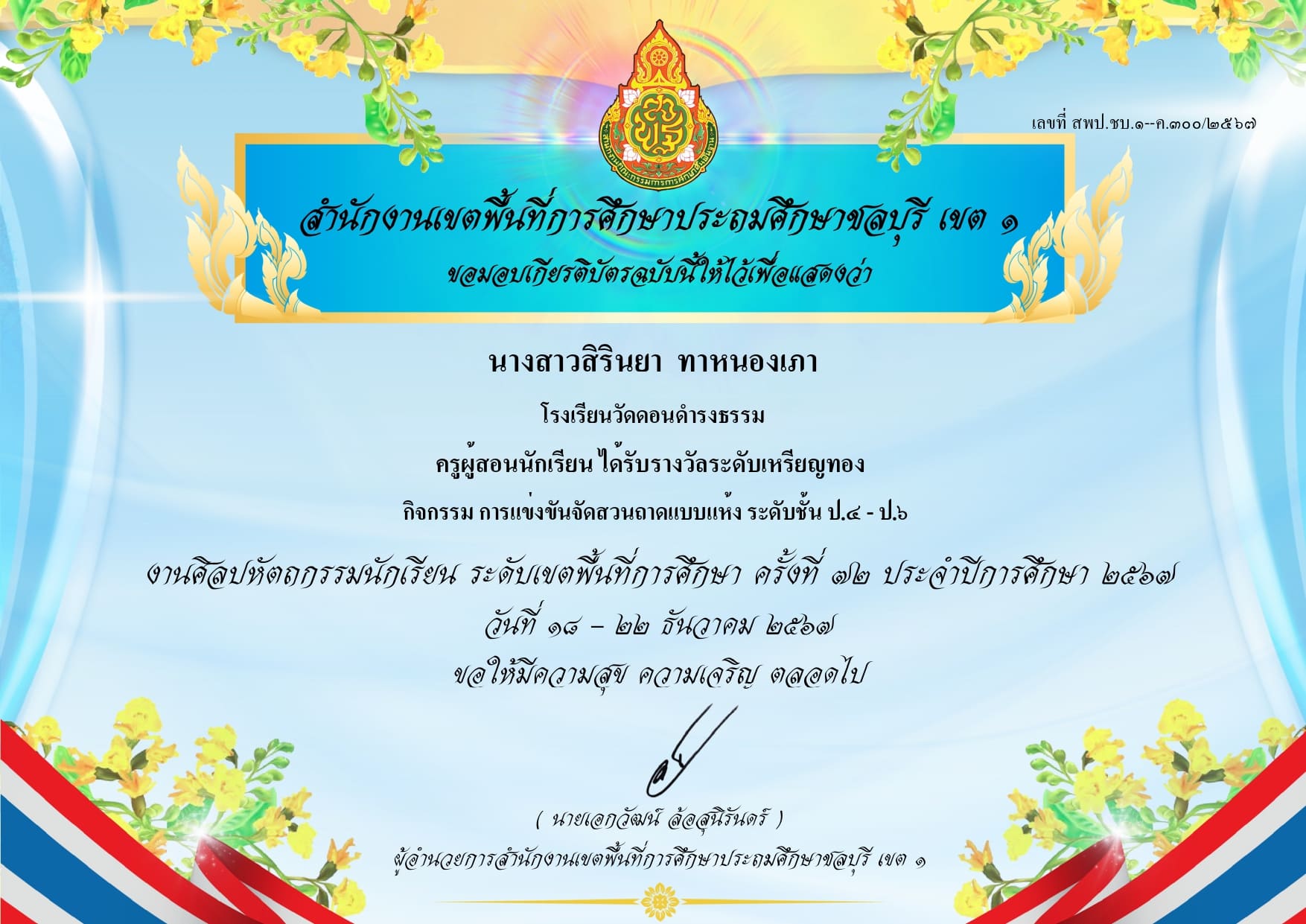 ครูผู้สอนนักเรียน ได้รับรางวัลระดับเหรียญทอง ชนะเลิศ กิจกรรม การแข่งขันทำอาหารคาวหวานเพื่อสุขภาพเชิงธุรกิจ ระดับชั้น ม.1 - ม.3 |